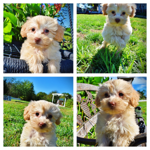 CLEARANCE PRICE!!  Video available at https://youtu.be/j8PHTifa1q4 – Introducing Vixen with her first haircut! She was born on 06/23/2025 and turned 8 weeks old on 08/18/25.  She currently has brown-hazel eyes and has a Chocolate & White coat. Some puppies change colors with age. Estimated adult weight is 12-14 lbs.   She is a Havanese hybrid, AKA HavaPoo. Please use the BUY NOW or a DEPOSIT to reserve this puppy. Our puppies are of good disposition and some with champion lineage with the sired Poodle, making the hybrid portion, aka HavaPoo. The Havanese hybrid is more dependent and an excellent cuddler. The Havanese hybrid want to be next to, or on you. The Havanese hybrid do learn quickly, and Havanese hybrid are extremely intelligent. Patience and persistence is the key to earning their trust…just like training a child.  This puppy is already vet checked and ready to come home soon.  Call me if you have questions about the size or coloring and I’ll do my best to take an educated guess for the age. Hair coat colors and estimated sizes do change with age of the puppy.  If we cannot meet you here, we are still able to transport puppies. Sometimes to your door and other times to an airport close to you.  Call for transport pricing to where you live with airline or to your door delivery. Airline is $550. Ground estimates start at $250 , then $.75 a mile from zip code 65706.  All puppies are microchipped and can be registered for you FREE of charge. Visits are welcome and  encouraged as we are proud of these puppies and do like to meet the new parents if possible.  We show puppies at 7 weeks of age (once they’ve had their 2nd set of vaccinations).  We also offer video chats, typically on the weekends by appointment.  If you just can’t wait for one of our beautiful pups and you wander off, please only pay using a credit card to other breeders/pet stores.  There is an estimate that 80% of puppy ads are scams. We want you to have a good experience purchasing a puppy, no matter where you purchase it from.  We own the parents and they are on site at our home.  Thank you.